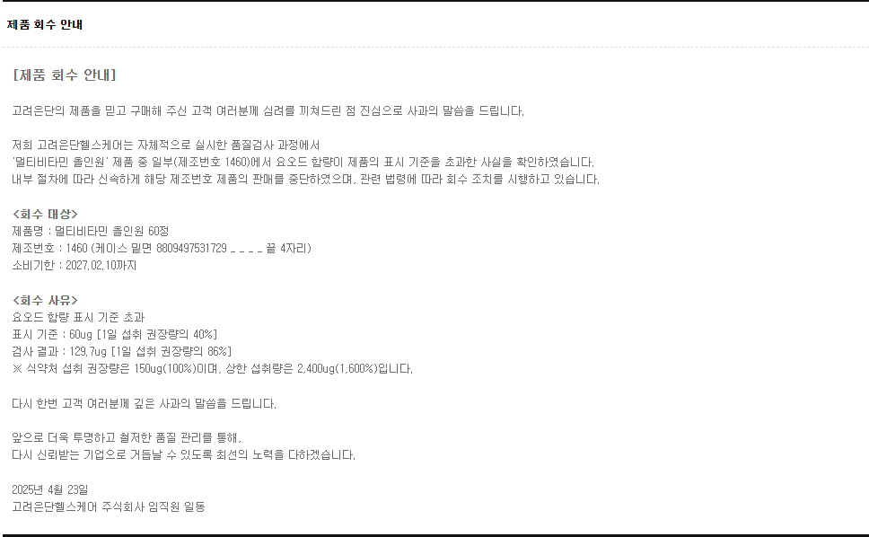 최근 이슈가 된 고려은단 제품 회수에 대해 기사가 많이 뜨고 있습니다.